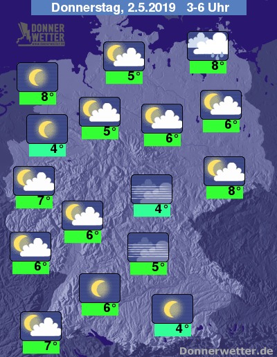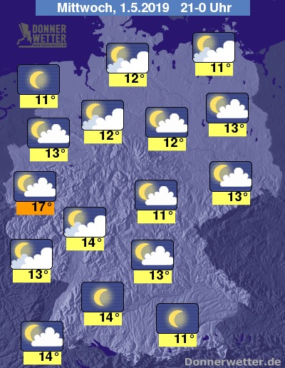 Während der zweiten Nachthälfte kann es an der Ostseeküste bei frischem Westwind stellenweise tröpfeln. Sonst zeigen sich teilweise für längere Zeit Mondsichel und Sterne. Dort wo am Vorabend Regengüsse gefallen sind kann sich Nebel bilden.