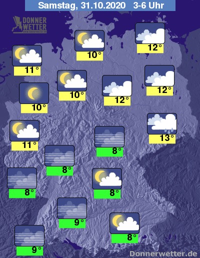 Bis zu den Frühstunden kühlt die Luft im Süden auf 7 bis 9 Grad ab, im Norden bleiben die Werte im zweistelligen, milden Bereich.