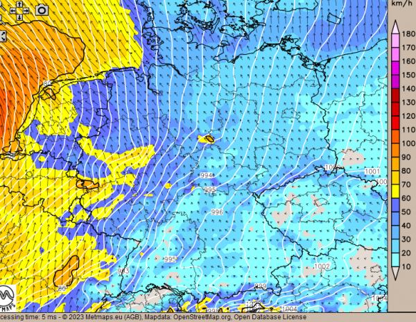 Am Donnerstag droht im Westen Sturm: Hier die Böenkarte morgens 06 Uhr (c) metmaps/donnerwetter.de.