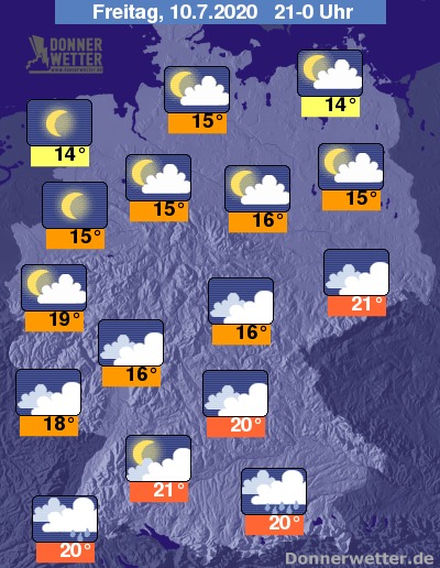 Am frühen Abend gibt es noch große Temperaturunterschiede im Lande. Die Spannbreite reicht von kühlen 14 oder 15 Grad an den Küsten von Nord- und Ostsee und heißen 30 Grad in, sowie rund um München, sofern es noch nicht geregnet hat.