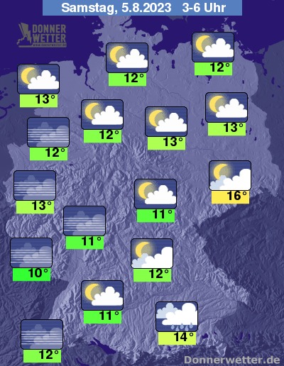 In der Nacht zum Samstag hält sich vor allem im Süden und Osten noch oft starke Bewölkung, an den Alpen bilden sich auch zeitweise Regen, sonst bleibt es trocken. Im übrigen Land ist es verbreitet nur locker bewölkt und teils sternenklar, dazu bleibt es ebenfalls trocken. Die Temperatur sinkt auf 16 Grad in Dresden und bis 10 Grad in Saarbrücken.