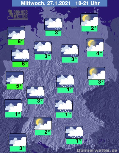 Am Abend kommt der Niederschlag weiter ostwärts voran und fällt in höheren Lagen als Schnee, in den Niederungen eher als Regen oder Schneeregen. Vor allem im Bergland muss mit Straßenglätte gerechnet werden. Sowohl vor der Front, als auch dahinter kann die Wolkendecke stellenweise auflockern und einigen Sternen Platz machen.