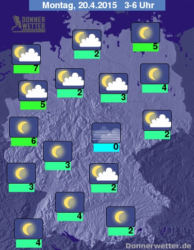 In der Nacht zum Montag ziehen in einem sehr breiten Streifen vom Nordwesten Deutschlands bis in den Osten des Landes oft lockere Wolken durch. Sowohl nordöstlich als auch südwestlich dieses Bandes bleibt es hingegen verbreitet sternenklar. Bei Tiefstwerten zwischen 7 Grad an der Nordsee und 0 Grad im Vogtland bleibt es überall trocken.