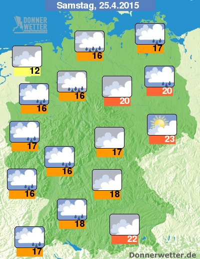 Am Samstag ziehen in der Westhälfte der Republik verbreitet dichte Wolken durch, dazu fällt zeitweise Regen. In der Osthälfte Deutschlands ist es vormittags noch meist aufgelockert, teils auch noch locker bewölkt und weitgehend trocken, am Nachmittag ist es aber auch hier meist stark bewölkt, dazu fällt gegen Abend auch gebietsweise Regen. In den östlichsten Landesteilen bleibt es aber überwiegend trocken. Die Temperatur steigt auf 12 Grad an der Nordsee und 23 Grad in Dresden.