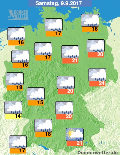 Auch die Temperaturen pendeln sich wieder ein wenig ein und erreichen im Tagesverlauf Werte um 17 Grad C im Emsland und um 21 Grad C in Dresden.