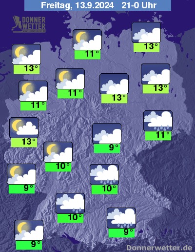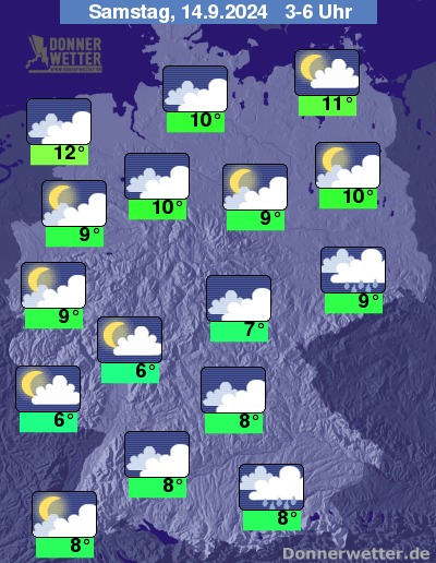 In der Nacht zum Samstag bleibt der Himmel vom Alpenrand bis in die Lausitz bedeckt und es fällt anhaltender, teils ergiebiger Regen; die Schneefallgrenze sinkt auf 1.300 Meter. In den übrigen Landesteilen ist es teils wolkig, teils aufgelockert bewölkt und es bleibt weitgehend niederschlagsfrei.