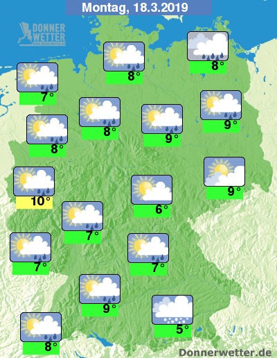 Am Montag ist es verbreitet wechselnd bis stark bewölkt, dabei bilden sich wiederholt Regen-, Schneeregen-, Schnee- oder Graupelschauer. Die Temperatur erreicht 5 Grad in Rosenheim und bis 10 Grad in Bonn. Im Norden weht starker bis stürmischer Wind, an den Küsten herrscht verbreitet Sturm.