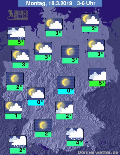 In der folgenden Nacht fällt zunächst über Sachsen und über Süddeutschland unter dichten Wolken zeitweise Regen oder Schneeregen, die Niederschläge ziehen sich zum Morgen hin vor allem auf Bayern und den übrigen Alpenrand zurück. Nordwestlich des Niederschlaggebiets ist der Himmel oft locker bewölkt oder sternenklar und dazu bleibt es trocken. Dichte Wolken und einzelne Schauer sind im Nordwesten des Landes möglich. Die Temperatur sinkt auf 5 Grad im Emsland und bis 0 Grad im Eichsfeld.