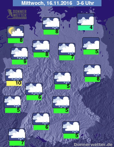 In der Nacht zum Mittwoch halten sich über der Republik meist dichte Wolken, dazu fällt zeitweiliger, vor allem über der Südhälfte zum Teil auch langanhaltender Regen. Im Norden klingen die Niederschläge im weiteren Verlauf meist ab und einzelne Auflockerungen sind möglich. Die Temperatur sinkt auf 10 Grad in Köln und bis 4 Grad an der Müritz.