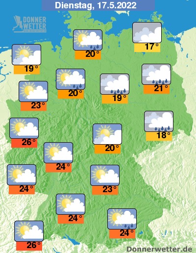 Am Dienstag ist es im Süden und Westen oft heiter, zum Teil ziehen hier auch einige Wolkenfelder durch, jedoch bleibt es dabei meist trocken. Im übrigen Bundesgebiet ist es oft stark, teils aufgelockert bewölkt, dabei bilden sich gebietsweise Schauer. Die Temperatur steigt auf 17 Grad an der Ostsee und bis 26 Grad am Oberrhein.