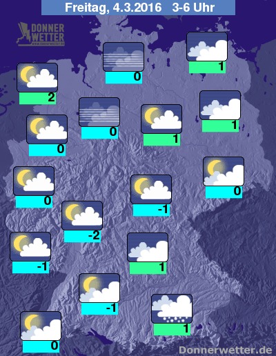 Am Freitag ist es zunächst zumeist leicht bis aufgelockert bewölkt und dazu trocken, von Südwesten ziehen jedoch schon rasch dichte Wolken mit zeitweiligem Regen, zum Teil auch Schneeregen oder Schnee auf. Im Norden und Osten nimmt die Bewölkung zwar immer weiter zu, hier bleibt es bis zum Abend jedoch meist trocken. Die Temperatur steigt auf 3 Grad am Westerwald und bis etwa 8 Grad im südlichen Brandenburg.