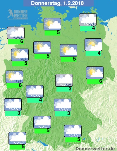 Am Donnerstag ist es vor allem im Süden oft nasskalt mit Schnee-, Schneeregen- oder Regenschauern. Auch im Küstenumfeld und teils über der breiten Mitte des Landes ist es oft stark bewölkt, dabei ist es aber meist trocken. Vor allem von Sachsen bis nach Niedersachsen scheint auch immer wieder mal die Sonne zwischen den Wolken, hier bleibt es überwiegend trocken. Die Temperatur erreicht 3 bis 6 Grad.
