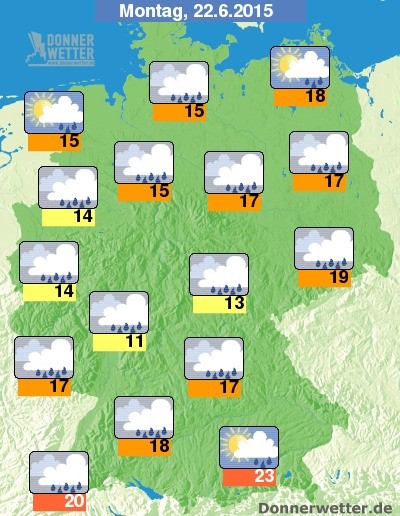Heute bleibt es den Tag über verbreitet stark bewölkt und es zeigen sich nur selten Auflockerungen am Himmel. Dazu fällt immer wieder, oft auch schauerartiger Regen. Im Norden und Westen sind zudem Gewitter möglich. Die Temperatur steigt auf teils nur 11 Grad im Westerwald und bis 23 Grad in München.