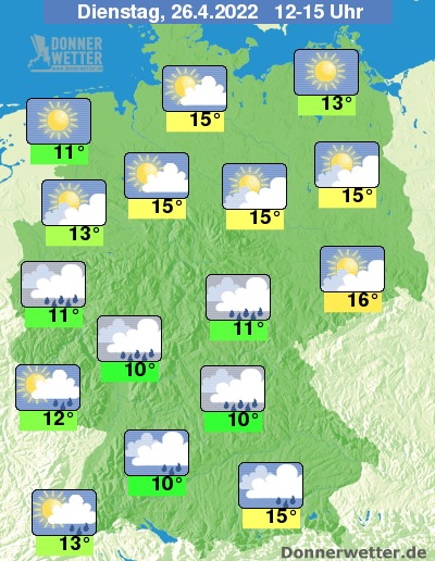 Heute Nachmittag ist es über der Südhälfte der Republik meist stark bewölkt oder bedeckt, dabei bilden sich wiederholt Schauer und im Südwesten auch einzelne Gewitter. Im übrigen Bundesgebiet ist es oft locker, teils auch stärker bewölkt, aber weitgehend trocken. Die Temperatur liegt bei 10 Grad in Mittelfanken und 16 Grad in der Lausitz.