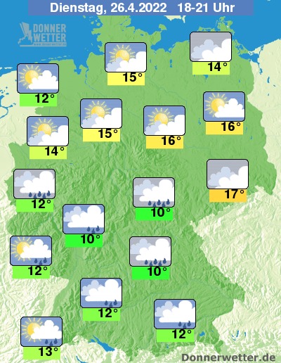 Heute Abend ist es über der Südhälfte meist dicht bewölkt und es fällt gebietsweise Regen oder es bilden sich einzelne Schauer, im Südwesten können sich Gewitter entwickeln. Weiter nach Norden hin ist es größtenteils aufgelockert, teils auch stark bewölkt und dazu trocken. Die Temperatur liegt bei 10 Grad am Westerwald und bis 17 Grad in der Lausitz.