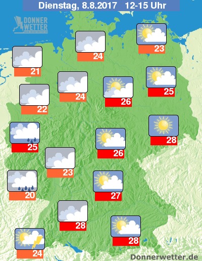 Heute Abend nimmt auch die Bewölkung in den östlichsten Landesteilen immer mehr zu, dabei ist es aber anfangs noch meist trocken, sonst ziehen hingegen verbreitet dichte Wolken durch und es entwickeln sich wiederholt Schauer und zum Teil kräftige Gewitter. Die Temperatur liegt bei etwa 22 Grad in Bremerhaven und bis 29 Grad in München.