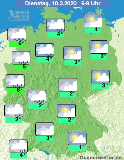 Der Dienstag startet in der Westhälfte mit einer meist geschlossenen Wolkendecke, aus der in den Frühstunden immer wieder Regen, in höheren Lagen auch Schneeregen oder Schnee fallen kann. Im Osten und Südosten wechseln sich Sonne und Wolken in den Morgenstunden ab und es bleibt meist trocken.