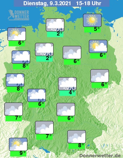 In den Nachmittags- und frühen Abendstunden bleibt der Himmel über weiten Landesteilen bedeckt, zeitweise Auflockerungen beschränken sich in den nächsten Stunden vor allem auf den Nordwesten und den äußersten Süden und Südwesten Deutschlands. Im Westen und Nordwesten muss immer wieder mit Niederschlägen gerechnet werden; diese fallen meist als Regen, oberhalb von 300 bis 400 m auch als Schneeregen oder Schnee.