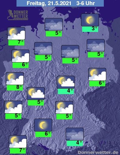 In der Nacht zum Freitag ist es über dem Land verbreitet locker bewölkt oder sternenklar. Im Laufe der zweiten Nachthälfte ziehen von Westen her mehr und teils dichte Wolken auf, die zum Morgen hin auch den Osten erreichen, dazu bleibt es aber trocken. Die Temperatur sinkt auf 8 Grad in Bonn und bis 3 Grad in Stralsund.
