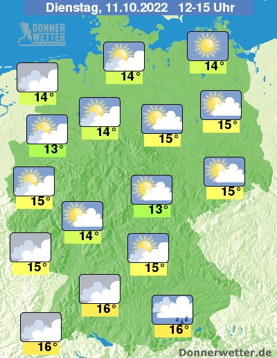 Heute Nachmittag halten sich über dem Süden überwiegend dichte Wolken, dabei sind direkt an den Alpen Schauer möglich. Im übrigen Bundesgebiet ist es oft heiter, teils ziehen auch einige, meist aufgelockerte Wolken durch, dazu bleibt es trocken. Die Temperatur liegt bei 13 Grad im Vogtland und 16 Grad im Breisgau.