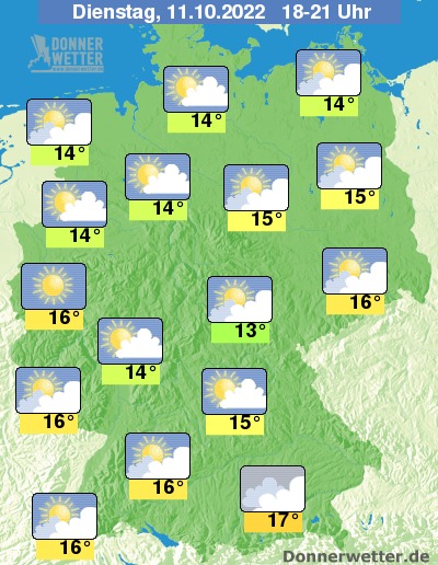 Heute Abend ist es über Deutschland größtenteils heiter oder sonnig. Südlich des Mains hält sich jedoch meist dichte Bewölkung. Bei Werten von 13 Grad in Jena und 17 Grad in München bleibt es trocken.