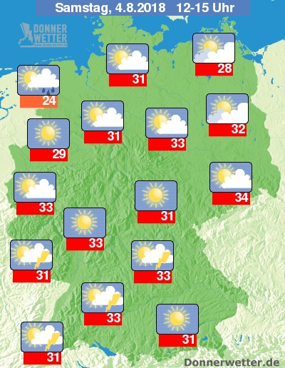 Heute Nachmittag ist es überwiegend heiter bis sonnig und trocken, vor allem im Süden besteht ein leichtes Schauer- und Gewitterrisiko, sonst können auch einige Quellwolken auftauchen, die jedoch nur ganz selten Schauer oder Gewitter bringen. Die Temperatur liegt bei 24 Grad in Wilhelmshaven und um 34 Grad in Dresden.