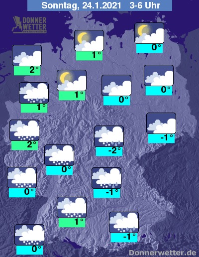 In der Nacht zum Sonntag zieht von Südwesten her Schneefall, zum Teil auch Schneeregen auf, der sich bis zum Morgen etwa auf die gesamte Südwesthälfte der Bundesrepublik hin ausbreitet. Weiter nach Nordosten hin ist es zwar meist stark, hin und wieder etwas aufgelockert bewölkt, jedoch bleibt es hier trocken. Die Temperatur sinkt auf 2 Grad am Niederrhein und bis -2 Grad im Thüringer Becken.