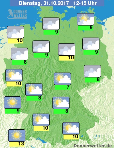 Heute Abend zeigt sich der Norden stark bewölkt und vor allem in Küstennähe fällt auch zeitweise Regen. Über der breiten Landesmitte ist es wechselnd bewölkt, oft auch heiter. Im Süden ist es mehrheitlich heiter bis sonnig. Es bleibt trocken bei 8 bis 13 Grad.