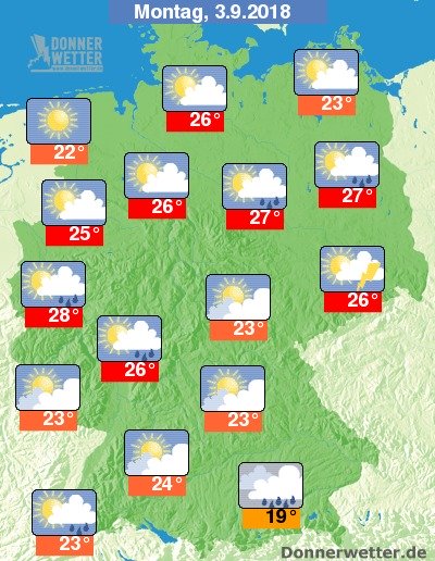 Am Montag ist es nördlich des Mains teils heiter, zum Teil ziehen aber auch dichte Quellwolken auf, dabei bilden sich hier und da Schauer und vereinzelt auch Gewitter. Iim Süden bleibt es überwiegend stark bewölkt, dabei bilden sich gebietsweise Schauer und mögliche Gewitter. Die Temperatur steigt auf 19 Grad in München und bis 28 Grad in Köln.