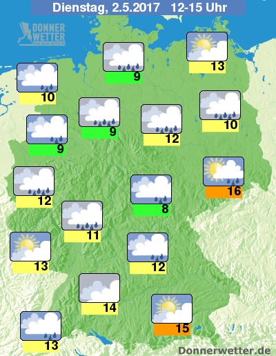 Heute Nachmittag ziehen verbreitet dichte Wolken übers Land hinweg, dabei fällt immer wieder, gebietsweise auch kräftiger Regen. Der Süden zeigt sich zum Teil aber auch heiter oder aufgelockert bewölkt, hier bleibt es zum Großteil trocken. Die Temperatur liegt bei kühlen 8 Grad im Grabfeld und bis 16 Grad in Dresden.