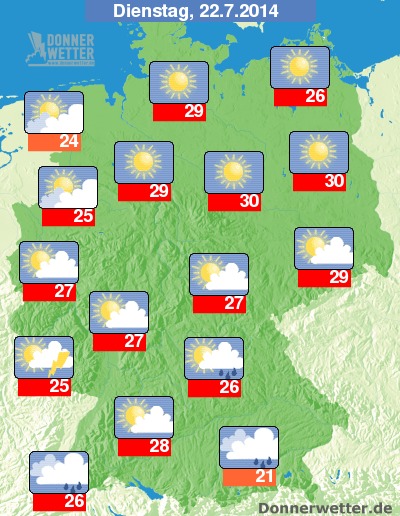 Der Dienstag zeigt sich schon wieder überwiegend freundlich und trocken. Im Süden müssen wir bei vielfach starker Bewölkung noch mit einigen Schauern und Gewittern rechnen, sonst zeigt sich zwischen den Wolken aber häufig die Sonne und es bleibt trocken. Die Temperatur steigt auf 21 Grad am Starnberger See und bis 30 Grad in der Hauptstadt Berlin.