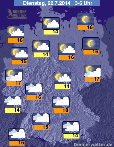 In der Nacht zum Dienstag ziehen über die Südhälfte der Republik weiterhin meist dichte Wolken und es fällt besonders im Südosten noch zum Teil gewittriger und ergiebiger Regen, besonders am Alpenrand. Nach Norden hin ist es dagegen meist aufgelockert bewölkt, von Berlin-Brandenburg zur Ostsee ist es sogar verbreitet sternenklar, dazu bleibt es hier trocken. Die Tiefstwerte liegen bei sehr einheitlichen 17 bis 14 Grad.
