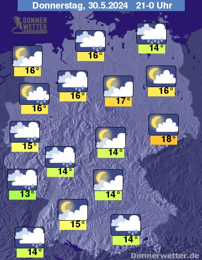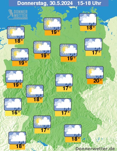 Am Donnerstagnachmittag zeigt sich der Himmel über weiten Landesteilen wechselnd oder stark bewölkt, dabei muss verbreitet mit Schauern und Gewittern gerechnet werden, lokal ist auch Starkregen möglich.