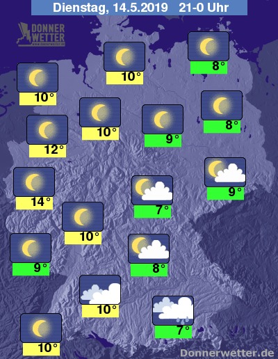 Am Abend werden die Schauer über Sachsen, Thüringen und Bayern allmählich seltener. Sonst kann man die allmählich untergehende Sonne von einem meist nur leicht bewölkten Himmel genießen.