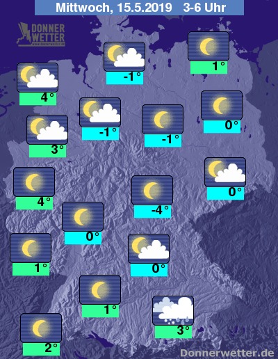 Bis zu den Frühstunden kühlt die Luft auf 4 bis 1 Grad im Westen, an den Küsten, sowie unter den dichteren Wolken im Süden ab. Sonst gibt es verbreitet leichten Spätfrost zwischen 0 und -4 Grad.