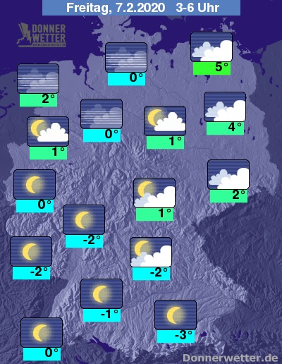 Bis zu den Frühstunden kühlt die Luft auf im Norden und Nordosten auf 0 bis 5 Grad ab, am mildesten bleibt es im Ostseeumfeld. Im Süden und Südwesten gibt es verbreitet leichten Frost zwischen -4 und 0 Grad, am Alpenrand kann es aber noch kälter werden Es muss mit Reifglätte gerechnet werden.