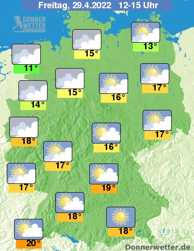 Heute Nachmittag ist es im Süden und Osten noch häufig heiter und teils sonnig, sonst ziehen jedoch überwiegend viele und nach Nordwesten zunehmend dichte Wolken durch, dabei bleibt es trocken. Die Temperatur liegt bei 11 Grad an der Emsmündung und 20 Grad am Oberrhein.