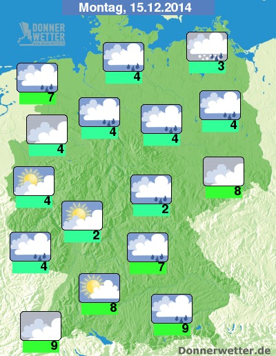 Heute ziehen oft dichte Wolken durch, die für zeitweilige Regenfälle sorgen, zum Teil fallen die Niederschläge auch als Schneeregen oder Schnee, dabei kann es glatt auf den Straßen werden. Die besten Chancen auf etwas Sonne gibt es noch im Westen und Südwesten des Landes. Die Temperatur steigt auf nasskalte 2 Grad im Grabfeld und bis 9 Grad am Alpenrand.