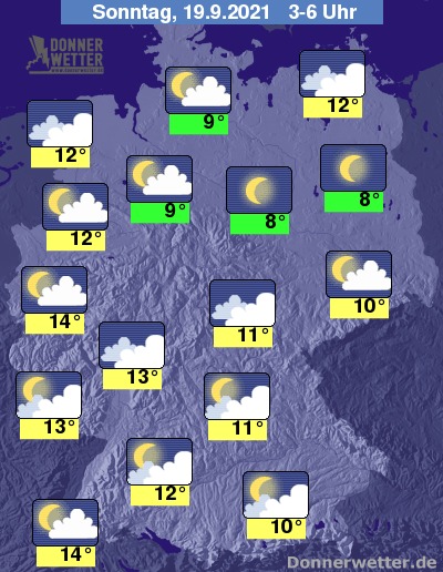 In der Nacht zum Sonntag zeigt sich der Himmel über dem Norden und Osten meist nur locker bewölkt oder sternenklar, im direkten Küstenumfeld halten sich jedoch meist dichte Wolken. Über der Südwesthälfte ist es teils locker bis aufgelockert, hier und da aber auch stark bewölkt. im Breisgau ist zum Morgen erster Regen möglich, sonst bleibt es aber trocken. Die Temperatur sinkt auf 14 Grad in Freiburg und bi 8 Grad in Berlin.