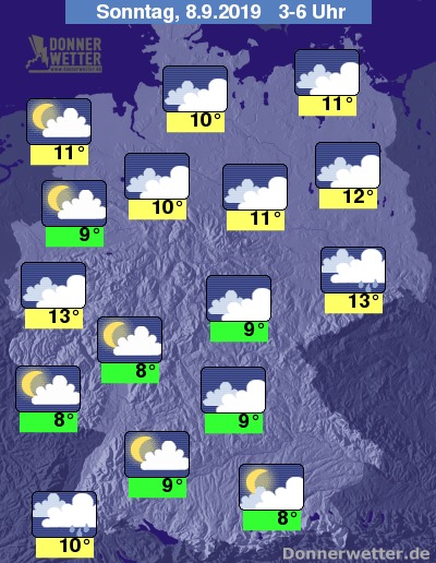 In der Nacht zum Sonntag ist es über den westlichen Landesteilen häufig locker bis aufgelockert und nur hier und da stärker bewölkt, im übrigen Bundesgebiet bleibt die Wolkendecke meist verschlossen, es bilden sich jedoch nur vereinzelt einzelne Schauer. Die Temperatur sinkt auf 13 Grad in Köln und bis 8 Grad am Taunus.