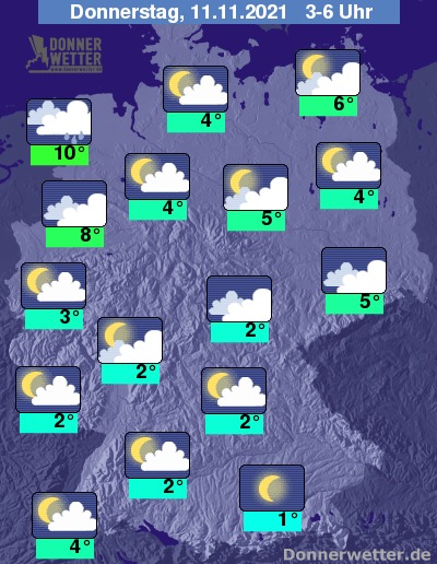 Am Donnerstag zeigt sich das Wetter im Süden oft heiter, teils neblig-trüb, im übrigen Bundesgebiet ist es überwiegend stark bewölkt oder bedeckt, dabei fällt aber nur selten etwas Regen. Die Temperatur erreicht 8 Grad im Eichsfeld und bis 14 Grad im Breisgau.