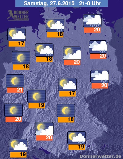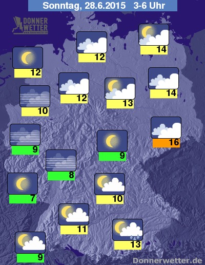 In der Nacht zum Sonntag halten sich im Norden, Osten und im Alpenvorland oft dichte Wolken und es können sich gebietsweise Schauer und auch einzelne Gewitter entwickeln. Im übrigen Land ist es hingegen oft sternenklar oder gering bewölkt und es bleibt trocken. Hier und da bildet sich Dunst. Die Temperatur sinkt auf 16 Grad in Dresden und bis 7 Grad im Saargau.
