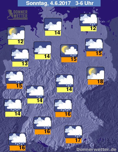 In der Nacht zum Sonntag halten sich verbreitet dichte Wolken und es fällt immer wieder, vor allem von Bayern, über Thüringen bis nach Sachsen anfangs oft gewittriger Regen. Im Nordwesten klingen die Niederschläge in der zweiten Nachthälfte ab und es lockert zum Morgen hin gebietsweise auf. Die Temperatur sinkt auf milde 18 Grad in Dresden und bis 12 Grad in Ostfriesland.