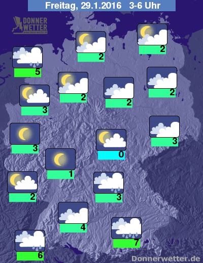 In der Nacht zum Freitag fällt im Süden weiterhin zeitweise Regen, der Niederschlag zieht sich aber zum Morgen hin mehr und mehr auf das Alpenvorland zurück. Nördlich des Regengebietes lockert die Bewölkung hier und da etwas auf und es bleibt trocken. Im übrigen Bundesgebiet ist es meist locker bis aufgelockert, hier und da aber auch mal stark bewölkt, jedoch zunächst trocken. Im weiteren Nachtverlauf ziehen im Nordseeumfeld und in Schleswig-Holstein jedoch dichte Wolken und Regen auf. Die Temperatur sinkt auf 7 Grad in München und bis 0 Grad im Grabfeld. Im Küstenumfeld weht starker und teils stürmischer, im übrigen Norden teils starker Wind.