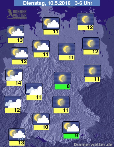 In der bevorstehenden Nacht zeigt sich die Osthälfte überwiegend sternenklar und dazu trocken. Nach Südwesten hin ist die Wolkendecke dagegen häufig komplett verschlossen oder es ist noch aufgelockert bewölkt, am Schwarzwald ist örtlich auch der ein oder andere Schauer möglich. In den übrigen Landesteilen ist es zumeist locker bis aufgelockert bewölkt und es bleibt trocken. Die Temperatur sinkt auf 14 Grad in Bonn bis etwa 8 Grad im Thüringer Becken.