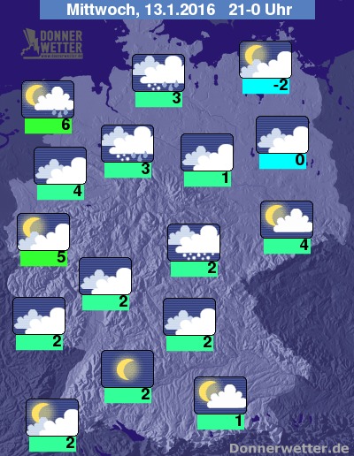 Am Donnerstag anfangs oft locker oder aufgelockert bewölkt, im Süden meist stark bewölkt, trocken, nachmittags im Süden und Westen bedeckt und zeitweise Regen, Schneeregen oder Schnee, -2 bis 5 Grad, an der Nordsee starker Wind.