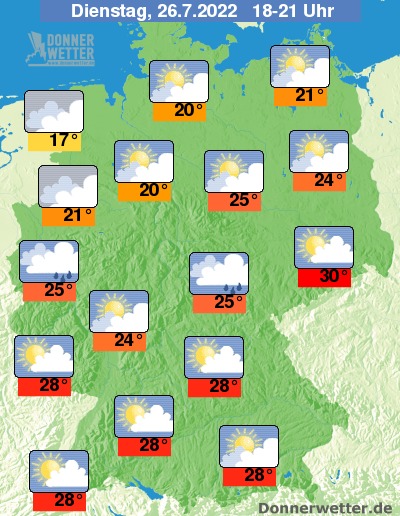 Heute Abend ist es im Süden meist heiter und trocken und im übrigen Land verbreitet wechselnd bis stark bewölkt. Es sind lediglich über der breiten Landesmitte vereinzelte Schauer möglich, sonst bleibt es trocken. Die Temperatur liegt bei 17 Grad in Bremerhaven und 30 Grad in Dresden.