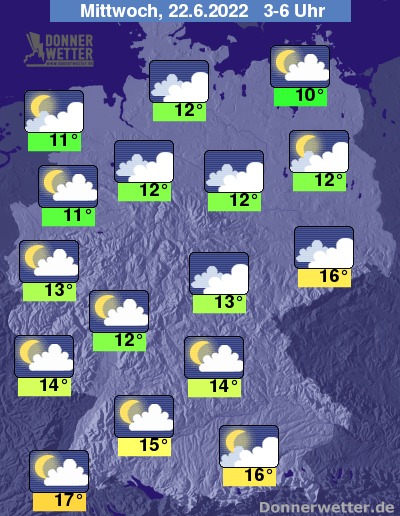 In der Nacht zum Mittwoch ist der Himmel teils locker, häufig aber auch stark bewölkt, dazu bleibt es weitgehend trocken. Die Temperatur sinkt auf 17 Grad am Oberrhein und 10 Grad an der Müritz.