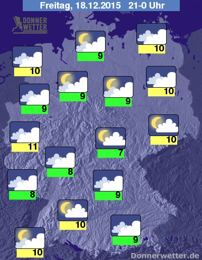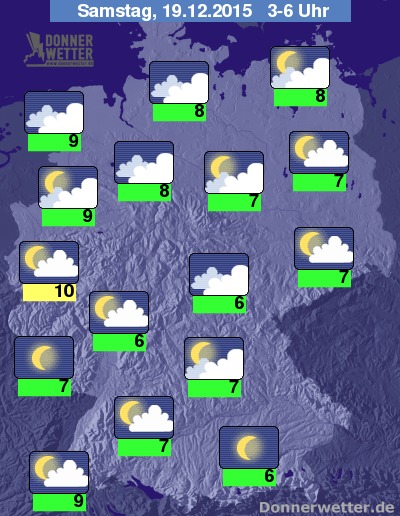In der Nacht zum Samstag ist es vor allem nach Süden und Südwesten hin oft nur leicht oder locker bewölkt. Im übrigen Bundesgebiet wechselt sich meist starke und aufgelockerte Bewölkung ab, dazu bleibt es trocken. Die Temperatur sinkt auf 10 Grad in Düsseldorf und bis 6 Grad in München.