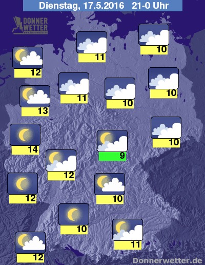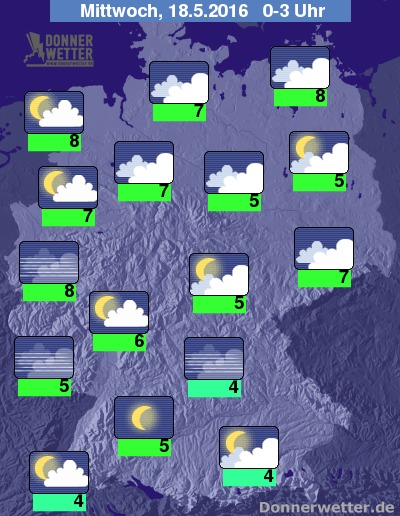 Am Abend lockert die dichte Wolkendecke im Nordwesten phasenweise auf, der Nordosten zeigt sich weiterhin bedeckt aber überwiegend trocken. Am freundlichsten bleibt es zwischen Donau und Main.